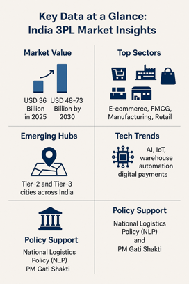 Fragmented logistics networks: India’s logistics system is highly unorganized, with multiple small players. This creates opportunities for 3PL providers to build integrated, tech-backed networks across regions.